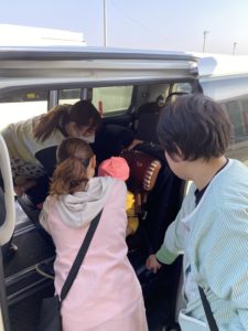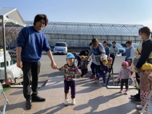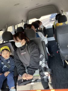 子どもたちは3台の車に分かれて先生にチャイルドシートに乗せてもらって、はなのかファームへ向かいました。