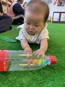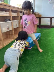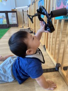 いつもそら組・にじ組のお友だちが遊んでいるので、自分でハイハイできるようになったうみ組のお友だちが触りに行っているところです。