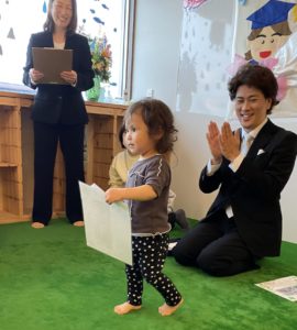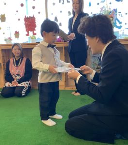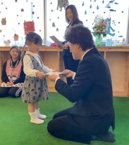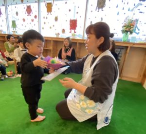 お名前を呼ばれると「はい!」としっかりお返事をして理事長先生から卒園証書をもらう姿ににじ組のこどもたちの成長を感じました。