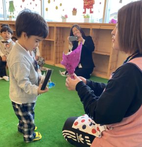 次に担任のゆうな先生から手作りの卒園アルバムと花束をもらいました。