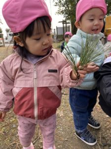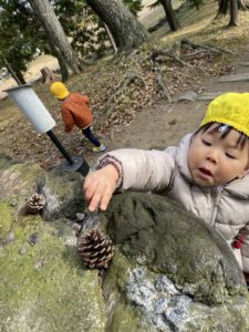 途中で見つけた松ぼっくりをお供えする1歳児さん。