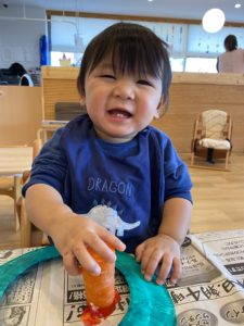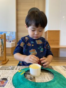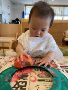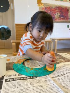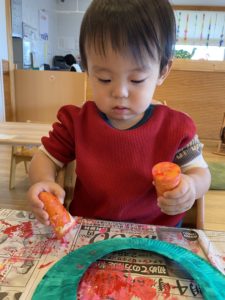 ちょっと脱線して、新聞紙にペタペタ押して楽しんでいますね(^^♪