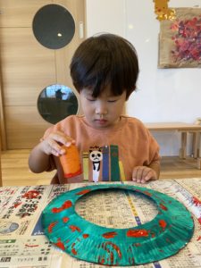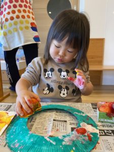 かおり先生が紙皿の真ん中をくり抜いて緑色を塗って、子どもたちが製作できるように準備をしてくれました。