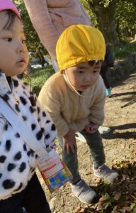 にじ組(2歳児クラス)の子どもたちは公園でいろいろ発見していたようです(^^♪