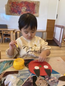 にじ組さんになるとお友だちとお話しながらお友だちが作っているお面を参考にしたり、先生と一緒にいろいろ考えたりすることができます。