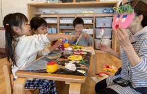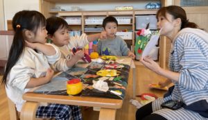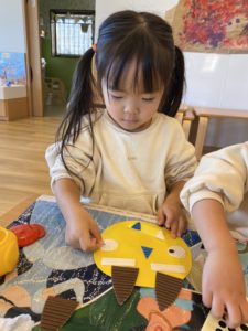 にじ組さんになるとお友だちとお話しながらお友だちが作っているお面を参考にしたり、先生と一緒にいろいろ考えたりすることができます。