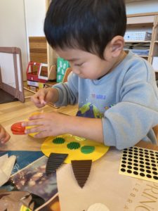 節分の豆まきに向けて1月のある日、にじ組(2歳児クラス)の子どもたちがお面を作っていました。