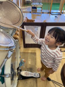 おそるおそる・・・かと思いきや、みんななかなか思い切りが良く、楽しそうに叩いていました!お家にドラムがあるお友だちは、叩き方のコツを知っているのか、かっこいい音も出していましたよ~♪