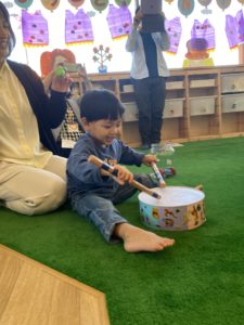 朝、登園してきた子どもたちから順番に、ゆい先生とドラムなどの楽器に直接触れさせてもらう時間も作ってくれました。どきどきしながらも、楽器に優しく触れてみたり、バチを持ってみたり、音を出してみたり♪
