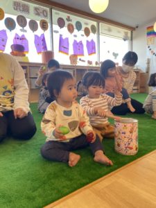 ゆい先生が保育の時間にリズム遊びをしてくれていました。それを今日は生演奏のリズムに合わせてやるという贅沢なリズム遊びも♪