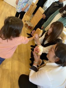 「はい、どうぞ」「ありがとう」と花束を渡すことでお礼を伝える体験もできました。ちょっぴり緊張したけど、喜んでもらえてよかったね。