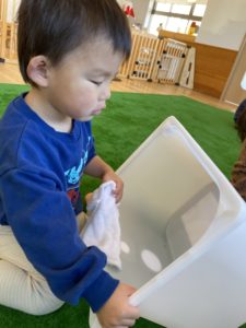 お友だちがやっていることって、楽しそう!やってみたい!という気持ちが動かされます。0歳児さんは自分の机をきれいにしています♪製作やお給食などで普段使っている机、ぴかぴかになると、嬉しいね。
