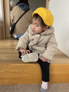 名前を呼ばれたら今度は自分で靴を履いてみています。お隣の友だちの様子を見ながら、片方ずつゆっくり。最初は難しくても、先生がお手伝いをしてくれる様子をよ~く見ながら、ベルトを剥がすことや足を奥まで入れることなどを知り、できることから挑戦中♪