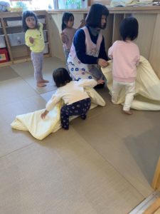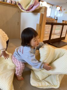 お昼寝から目覚めたら、お布団のお片付けをお手伝い♪自分の身体よりも大きなお布団、持てるかな~?