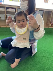 0歳児クラスのお友だちたちも、先生と一緒に手をあげてみたり、、