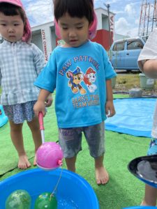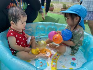 0歳児さんと1歳児さん、一緒に入ってヨーヨーすくいのお手伝い中♪
