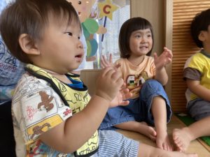 入園当初は、先生や周りのお友だちを見ていた0歳児さんも、楽しそうに参加することが増えました♪