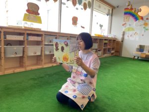 今朝、読んでもらった紙芝居の話を思い出して、子どもたちも口をおさえる真似や、小さくなって逃げる時の真似をすることができました。