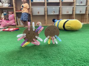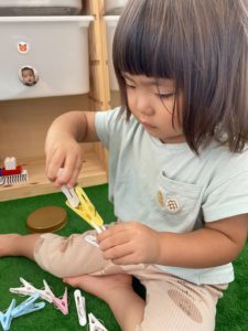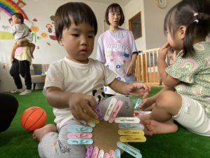 雨が降って外に行けない日や、いつものお気に入りのおもちゃに飽きてしまったときなど、ご家庭でもぜひ、洗濯バサミなど、お家にあるものでできる遊びをやってみてくださいね♪