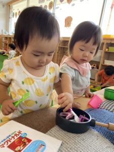 お皿に乗せたり、フライパンに入れたりして遊びます。おいしくできたかな?