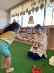 毎日、いろんな保育をする中で、「〇〇ちゃんおトイレでできたの!?すごーい!」子どもが作ったものを見て、「上手にできたね~!」などと、褒めるだけでなく、先生たちが子どもと一緒に喜ぶ姿がとっても多く見られます。