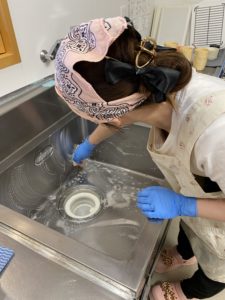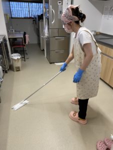 午後おやつを終えると、調理室のお掃除や消毒作業へ。