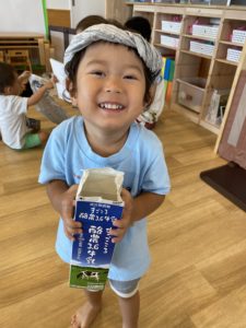 ちぎった新聞を牛乳パックにぎゅっと詰めています♪