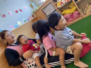 それは・・・まるで満員電車! 先生の足の上に「お邪魔しま~す」とみんなで並んで座る遊び♪