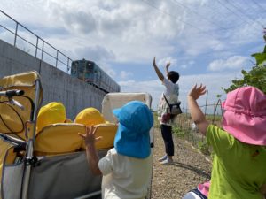 「あ、電車だ!!!」と通り過ぎる電車に元気に手を振ります。「やっほ~!」「ばいば~い!」