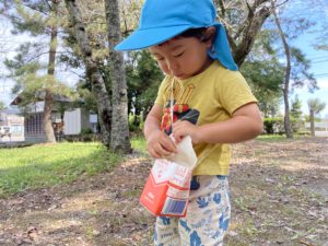 「自分だけのもの」「自分で見つけたものを入れる箱」という特別感があると、いつもの散歩も少し特別なものになりますね。見つけた石や木の実などを大事そうに入れています♪