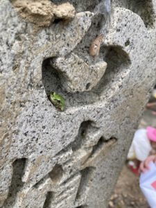 公園の名前が彫られている石の中に、なんと・・・きれいな黄緑色の「アマガエル」が!