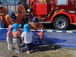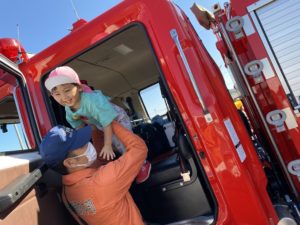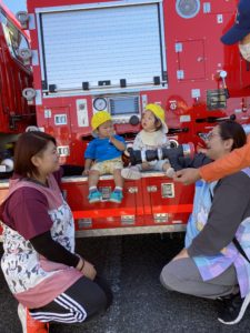 大きな消防車や消防士さんにちょっぴり緊張気味の0歳児クラスさん。先生たちと一緒に見たり、触らせてもらったりして、だんだんと笑顔が見られました♪