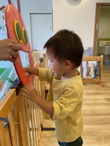 お口に入れてあげています♪ お友だちがやっていると「がんばれ~」という声が出てくる子どもたちです。優しい気持ちも育っていますね。応援するなかで、あれ?こんな近くに!