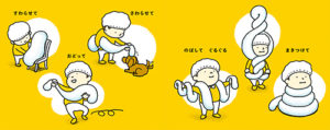 こねて、のばして、なにができるんだろう!?表紙のタイトルデザインからも、もちもちの生地が想像できます♪