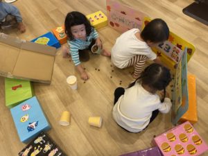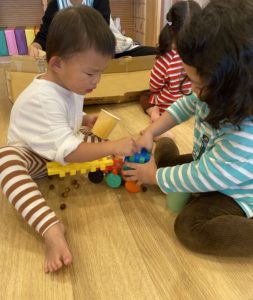 「ここに荷物入れてみたら?♪」と、ブロックで作ったトラックも登場!自分たちの自由な発想で遊びをだんだん発展していくことができる2歳児さんたちです。