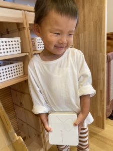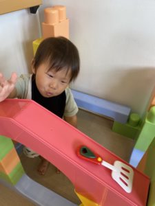 ななめにかかった大きなブロックにフライ返しを「しゅ~♪」 先生たちがすべり台を滑るときに子どもたちにかけている声を覚えていて、自分でも言ってみる姿がかわいいですね(^^)