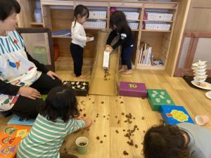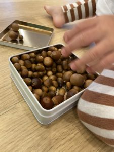 今度は、さやか先生が用意してくれた空き箱を使って、どんぐり集め。
