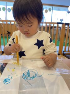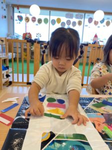 今度はぺたぺた!飾りを貼りながら、カラフルになってきた!