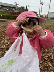 「見~えた!」と、凧の持ち手の穴から覗いています♪お友だちの凧あげの様子を見ているのかな。