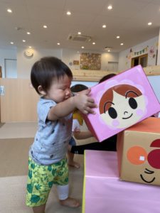 身長と同じくらいの高さまで積みあげることができて、嬉しそうな笑顔です(*’▽’)バイキンマンも「やったね!」と言っているかのようにウインク♪
