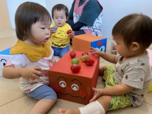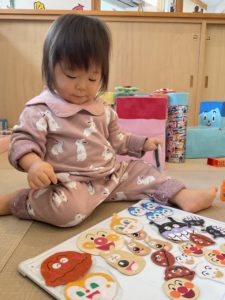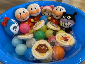 人形はもちろんですが、先生たちの手作りのこのかわいいアンパンマンたちでいろんな遊びをしています。