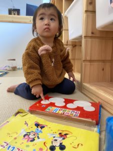 「ここにはミッキーいるよ!」と、見つけたことを目で先生に伝えているのかな?音が鳴る絵本も好きな0歳児さんたちです。