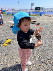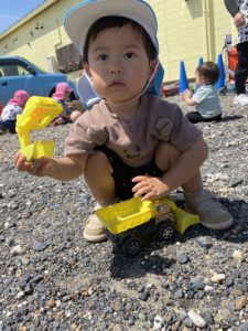 と黄色いショベルカーに色んな形の石を入れて遊ぶ姿も✨