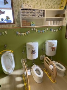 トイレも可愛く飾り付け♪ 座ってみるところから始め、オムツにおしっこが出る感覚から、便器に座って排泄をすることも子どもの様子を見ながら時間をかけ、練習していきます。オムツが濡れていないときに、座ってみて成功する体験は、子どもにとっても始めはあまりわからなくても、先生たちが一緒に喜ぶことで「できた!」という感覚に繋がっていきます。「園長先生~おしっこトイレででたよ~!」と嬉しそうに報告してくれる様子も見られます。