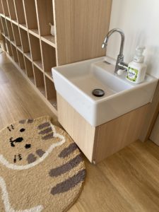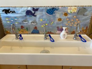 トイレの前にある洗面台は以前ブログでも紹介しましたが、海の仲間たちがお出迎えしてくれていますよ。ここでは主にトイレの後やおやつの前後に手を洗っています。