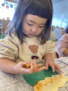 子どもたちはそれぞれ自分の好きな色を選んで、オリジナルの鬼を作っていきます。