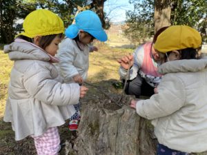 「まーぜまぜっ、まーぜまぜっ♪」と大きな切り株の中に拾ってきた龍の髭の実や松ぼっくり、葉っぱやどんぐりなどを入れて美味しそうなごはんの完成です。