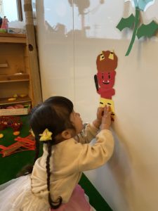 節分の日の翌週。朝の室内あそび中に、ホワイトボードの壁で子どもたちが遊んでいたのは鬼の壁面たち。