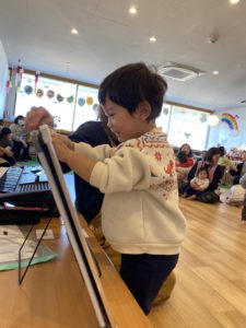 ピアノで「♪Hello 〇〇~」と子どもたちの名前を呼んで歌を歌います。この曲はとっても印象に残るようで、普段の生活の中で子どもが口ずさむ姿も見られます♡