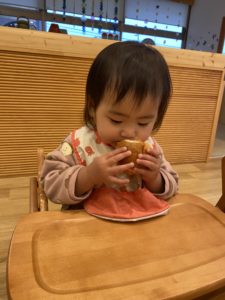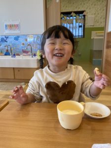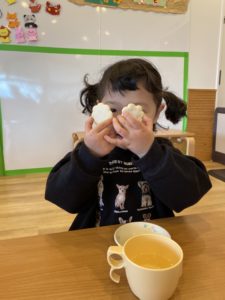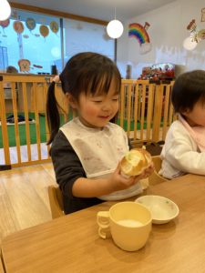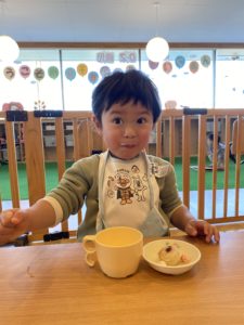 「美味しい!」と目をまんまるにして嬉しそうにしているこの日は、節分の行事のあとのおやつです。
